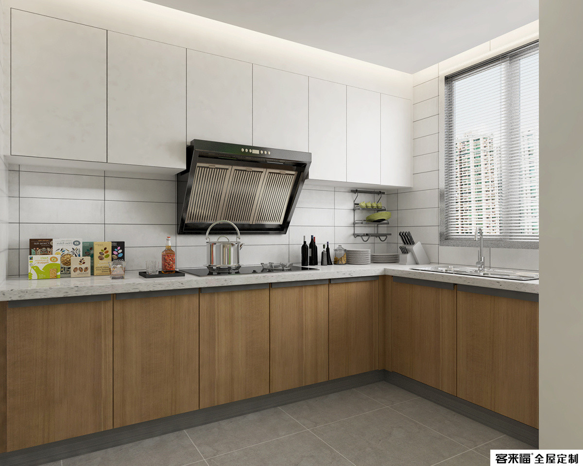 According to the apartment design, the L-shaped structure gives the kitchen a sense of enjoyment. The simple and elegant white of the top cabinet and the original wood color of the floor cabinet increase the simple and atmospheric line structure, making the kitchen a new field of minimalism.