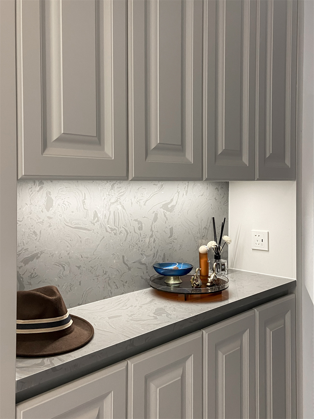 厨房是L型的橱柜布局,切菜区、台盆区、烹饪区形成一条动线,让烹饪不再手忙脚乱。芬兰白膜压橱柜门板,如奶油般的质感更加细腻自然。吊柜应当与台面保持距离,避免因为距离过近影响使用效果。