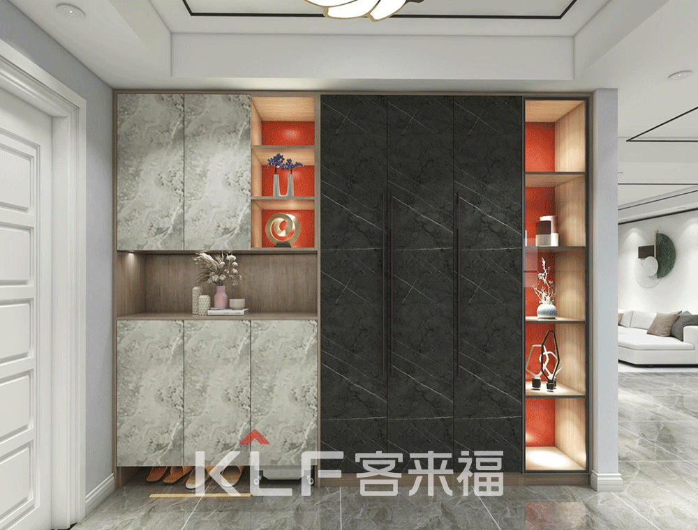 入户柜以大方简洁为基调,黑白纹理门板带来沉稳平和,镂空结合实门设计,在取舍之间,寻找微妙的平衡。背板荔枝红跳色更有视觉冲击感。