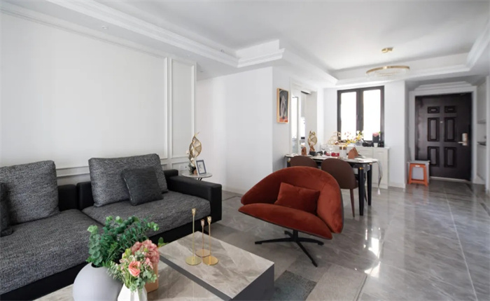 灰色皮质沙发一眼望去便能感受柔软的触感,白色的茶几下方铺上地毯,给轻奢增加一丝不寻常的味道,冬天可以把地毯抽出去孩子在上面玩耍,但是记得要及时打理。