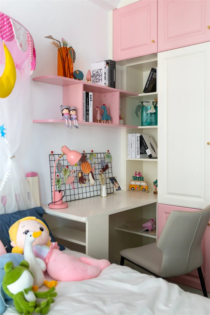 由于户主家有个小女孩,所以在颜色搭配上选择了粉粉嫩嫩的粉色,与白色中和,整体十分柔和,仿佛掉进糖果蜜罐里。床上放置了一些娃娃,也是非常用心了。