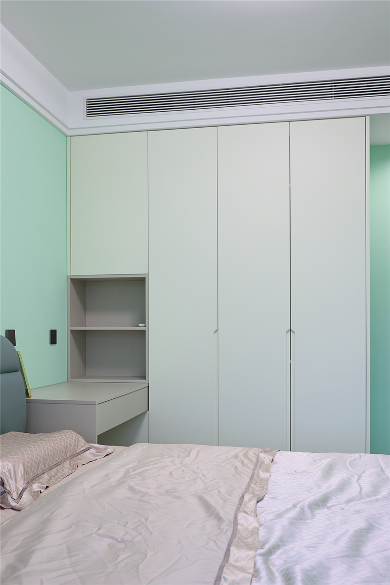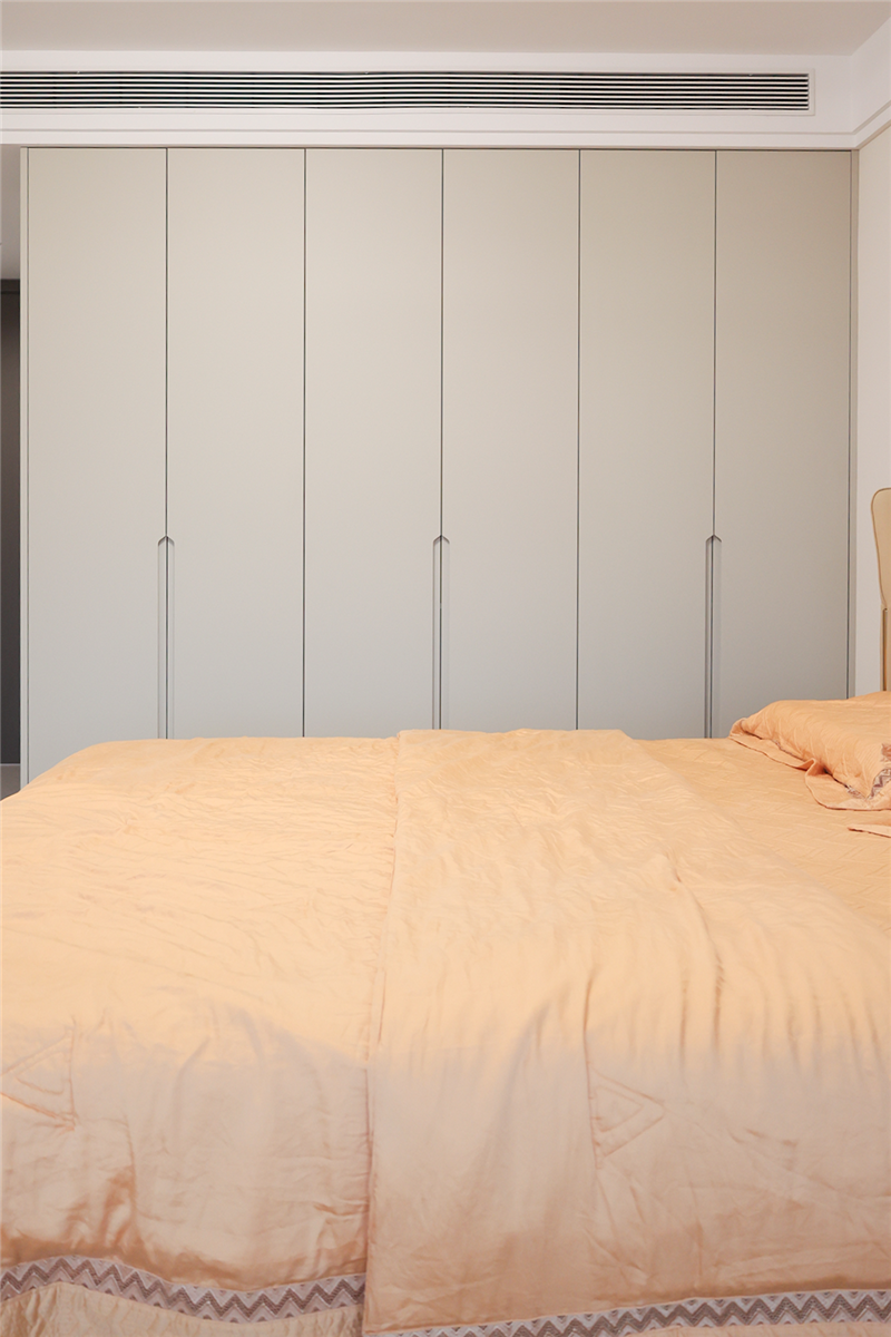 沿用主卧的一柜到顶,采用无拉手设计;衣柜延伸做床头柜,是小户型家庭的常见设计;整体空间简约而不简单,富含韵味。