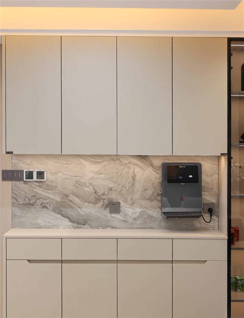 餐边柜融合玄关与酒柜,承担多重功能。一侧中部掏空,好看也方便放小物件;一侧小型酒柜采用双开玻璃门,内部隔层型材配合灯光,还充当了家里的展示柜。