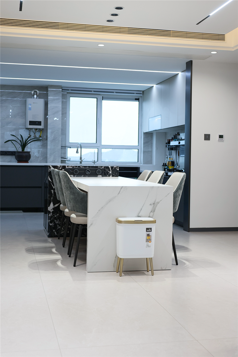 一体化岛台贯穿餐厅与厨房空间,黑白色系与整体空间氛围相协调,简单而不失实用性;整体开放式布局,以智慧动线合理利用空间,也方便家庭成员共同参与其中。