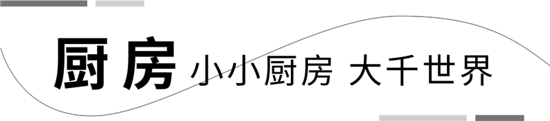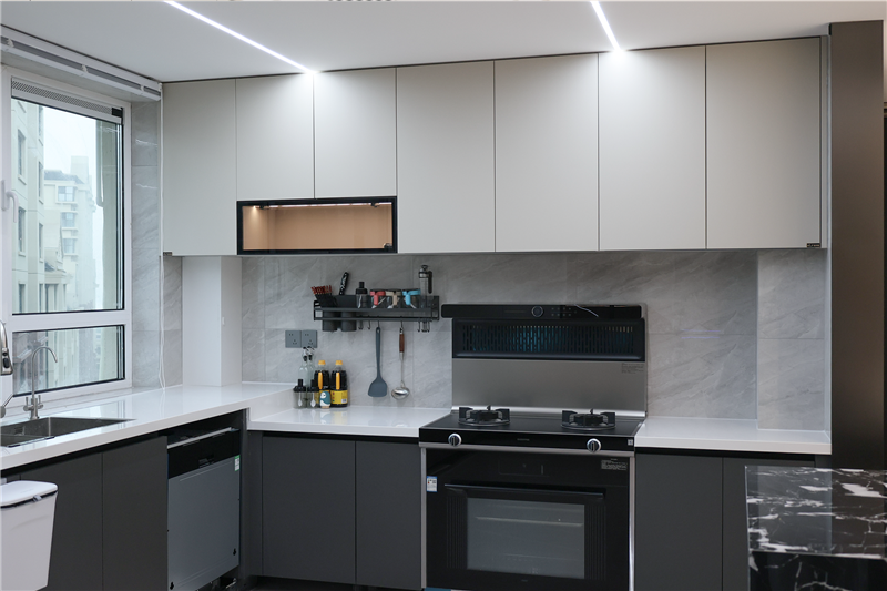厨房贴墙打造U型深灰色橱柜,配合茶白顶柜,融入创新水漆工艺,呈现高级美感;常见厨房构造,大小户型都适合;整体光线层次分明,使得空间清晰明朗。
