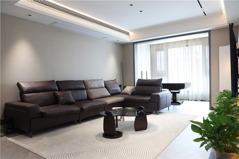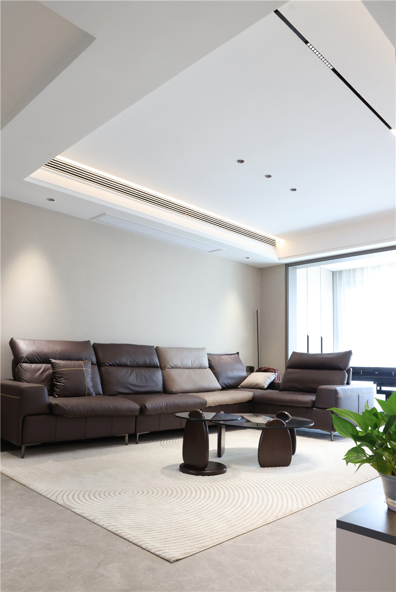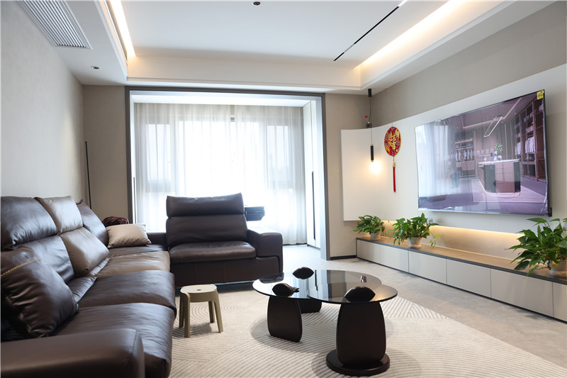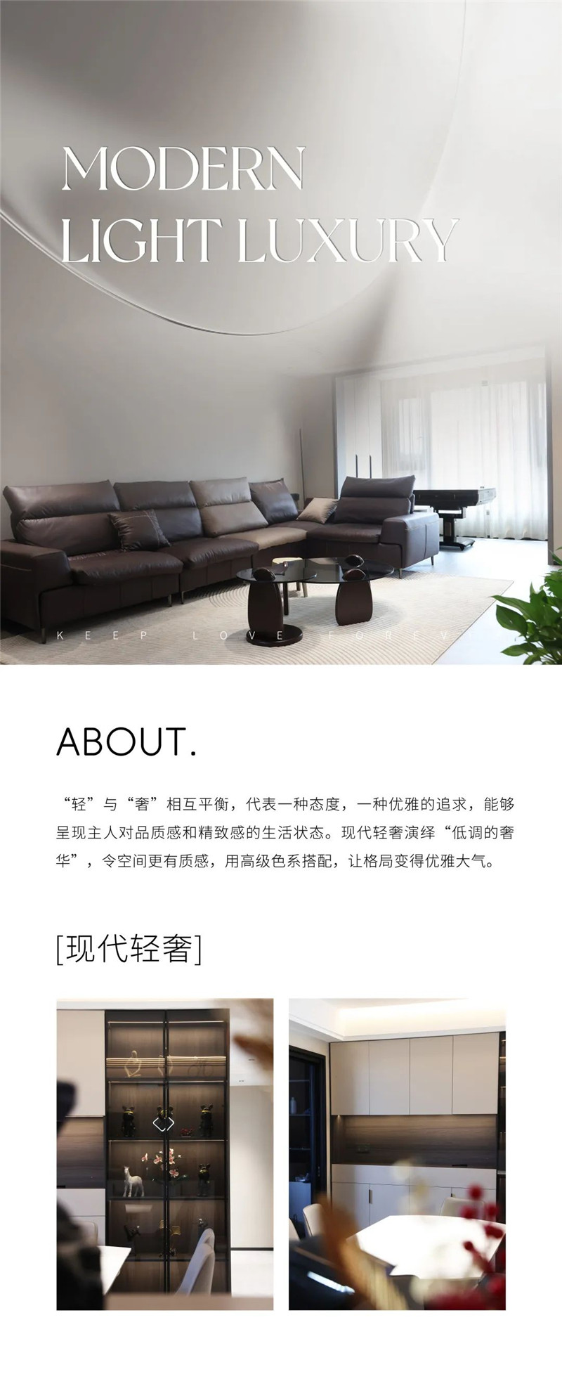 该全屋案例设计,风格隶属于现代轻奢,充分发挥客厅“门面担当”地位,呈现高级、大气客厅,但在卧室、厨房等空间更注重实用功能,体现出实用主义者与颜值至上的平衡。