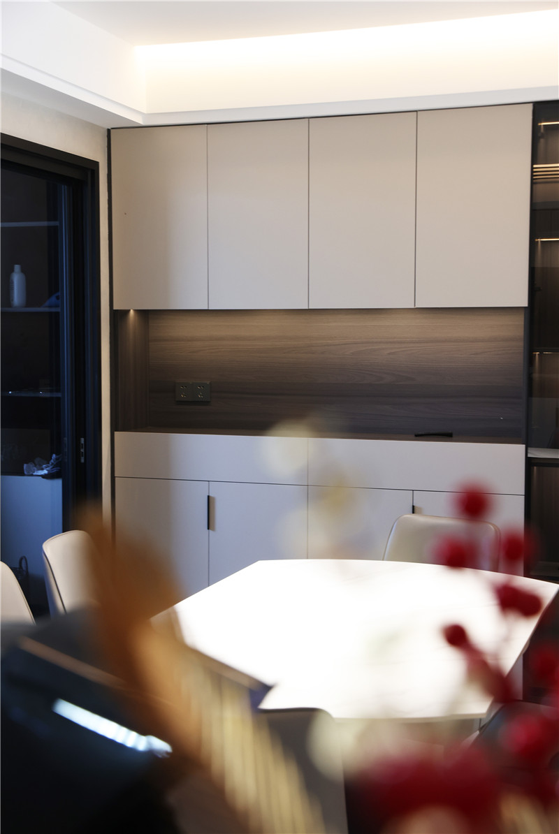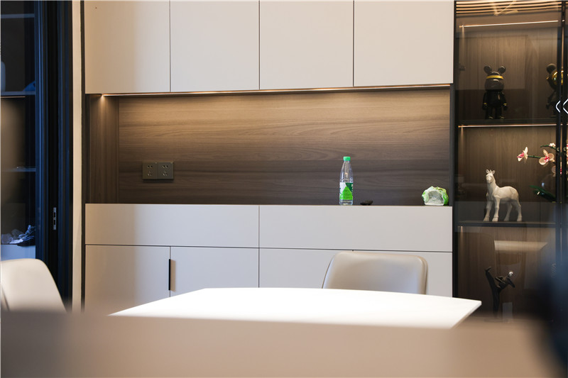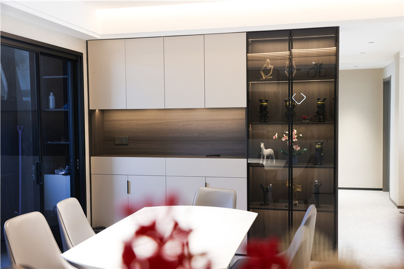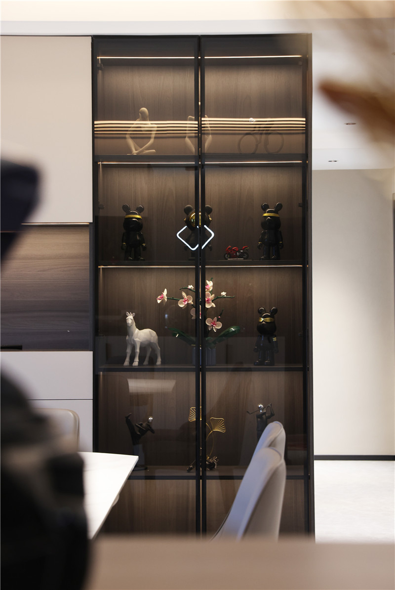 现代轻奢少不了细节的精致,玻璃柜内部木质纹理与内置灯带,形成自然与现代的碰撞;黑玻比透明玻璃更加高级时尚,也是装修时可以留意的设计点~