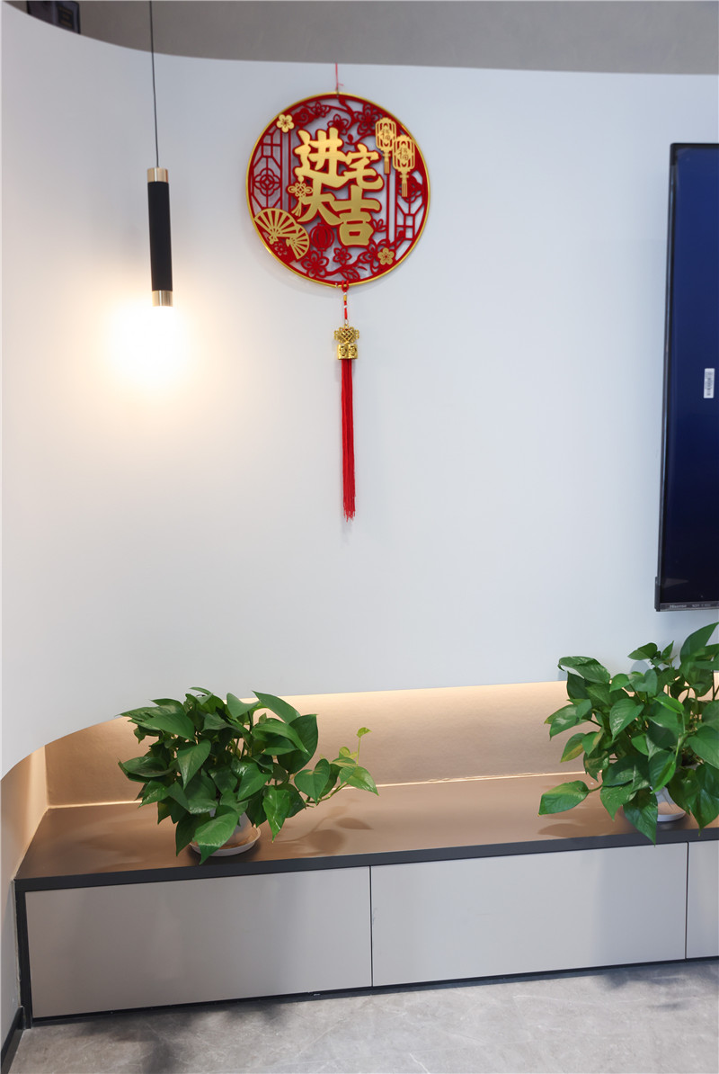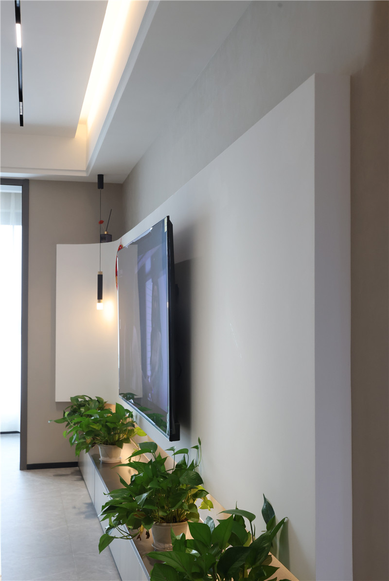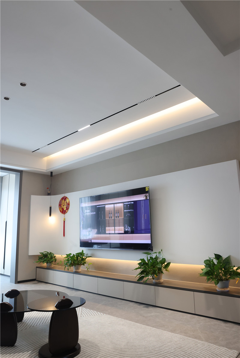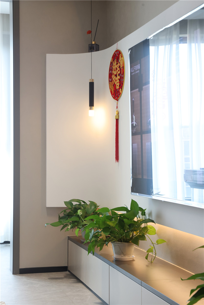 客厅作为门面担当,电视背景墙也处于举足轻重的地位。打破常规,不参照常用的设计手法,将电视背景作弧形电视墙,通过流畅的艺术线条,达到视觉的延伸,整体更具轻盈感。
