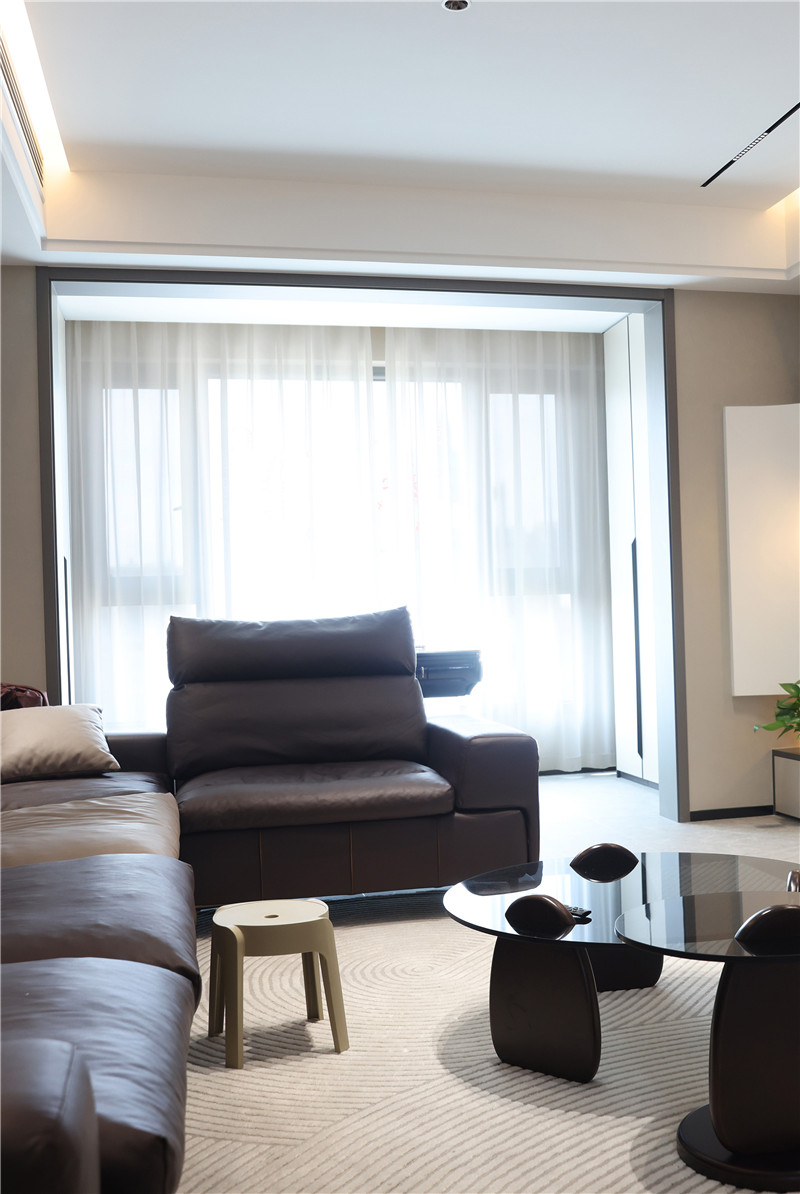 来到客厅,迎面而来是中性色调散发出的高级氛围,黑色亮面沙发、白色曲线地毯、黑色小茶几……整体表达出屋主时尚、个性的家居品味。