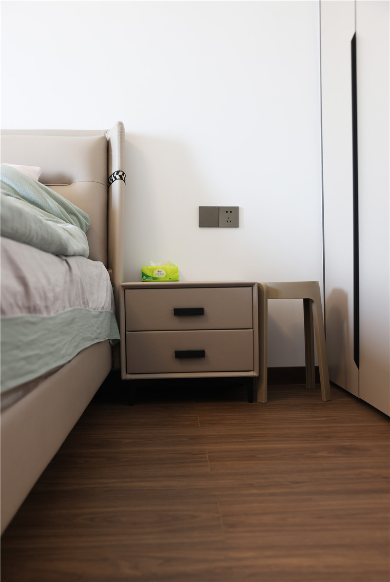 床头柜选用深灰色与浅色的科技木纹形成对比,让空间不单调,增加观赏性。