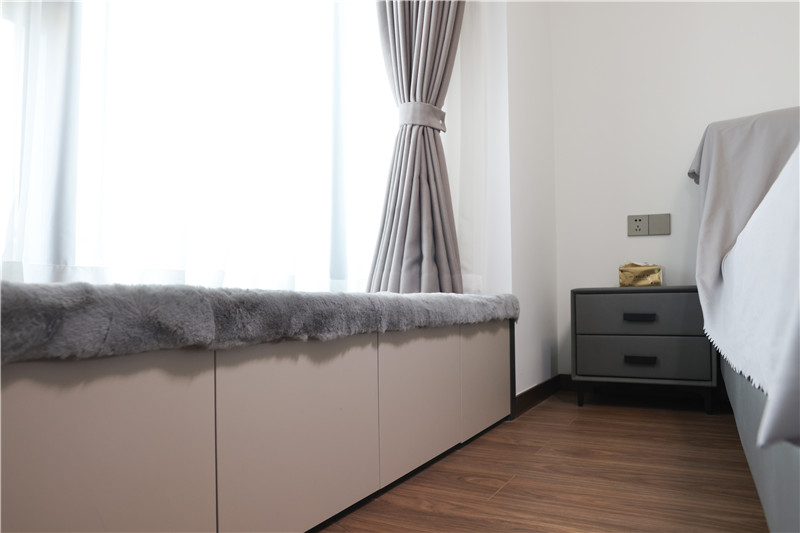 该卧室选用同种材质做柜体,窗户下打一组地柜增加收纳功能,上方铺上毛毯,略显精致。