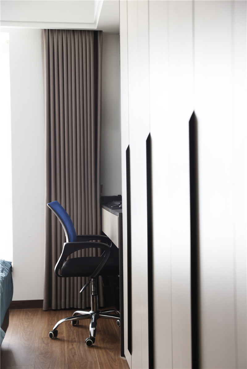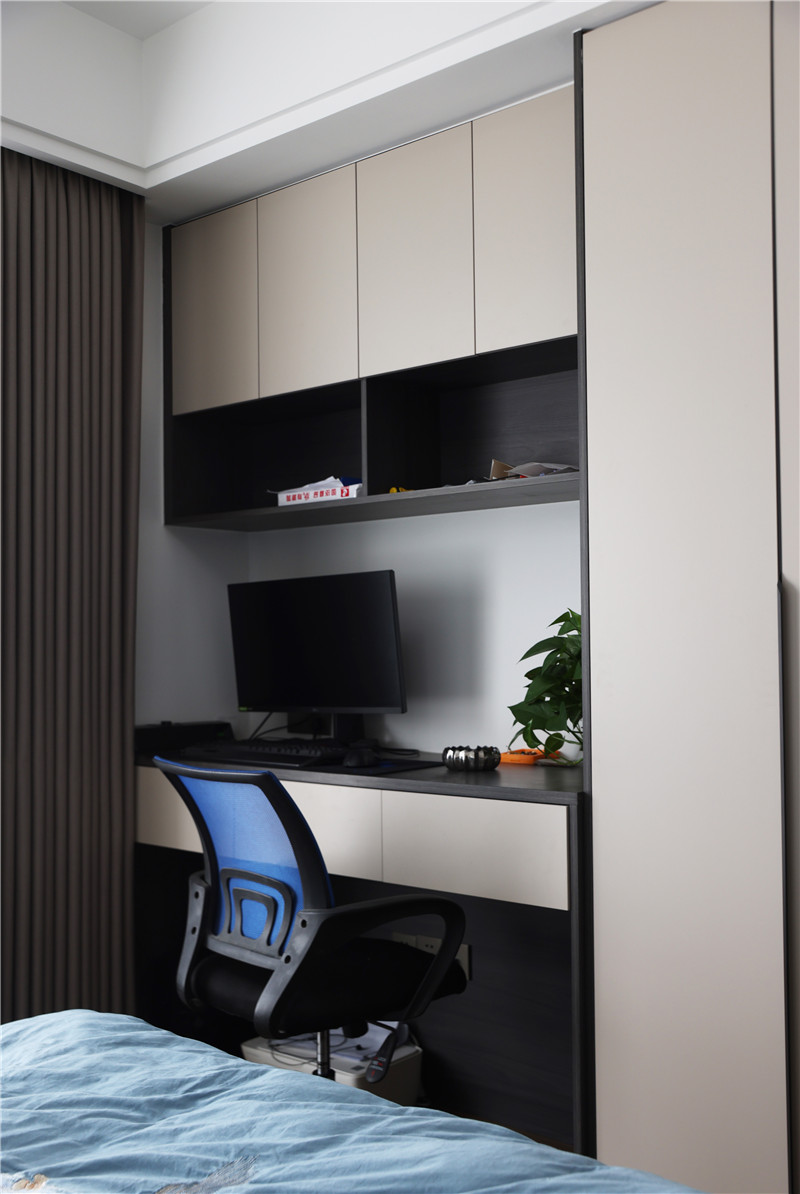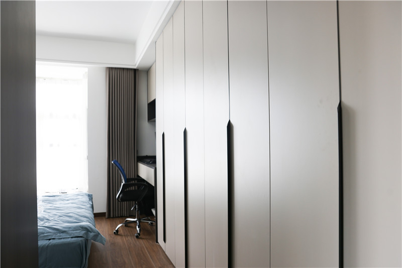 靠墙打一整面一柜到顶式衣柜,将其用作衣帽间+书桌,预留开放挂衣区,满足日常使用习惯;选用一字型长条拉手,视觉上简洁、时尚。