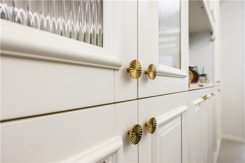 本案例中,柜类采用水漆工艺,0醛添加 0苯添加的环保属性下,呈现出产品的高级质感;柜体为芬兰白色调、柜门为极光色,给人以温暖治愈之感;造型板设计+太阳花拉手,古典高贵。