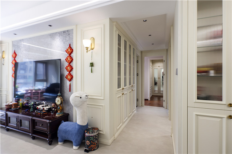 入户玄关柜为整面到顶构造,协调整体家居动线、自然美观;暖色系灯光、凹凸有致的玻璃等元素加入,营造出温馨氛围。