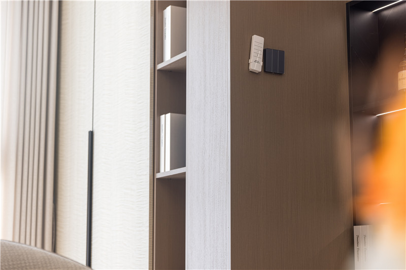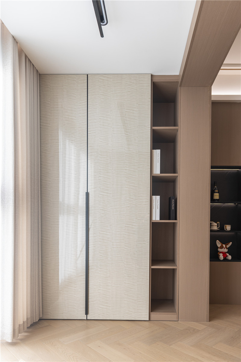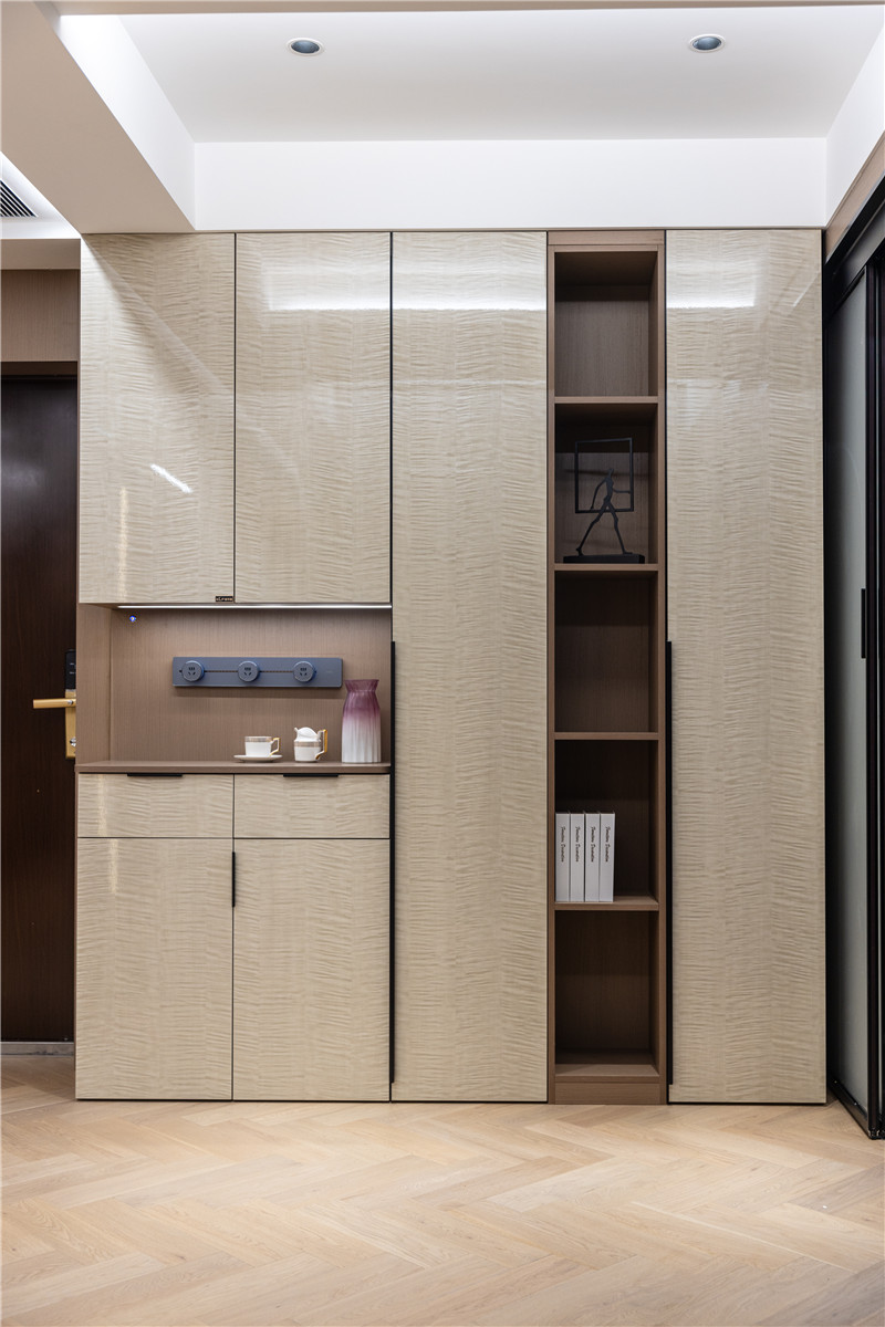 门板为枫影超晶板,亮光属性与光影配合,为空间增色;中部预留掏空、整面窄立隔板为开放式构造,是小物件、装饰物的存放地。