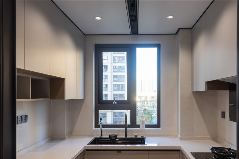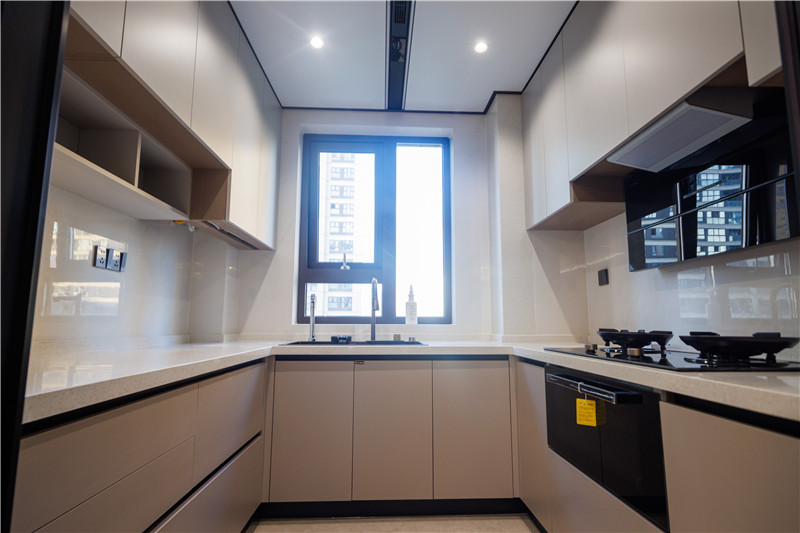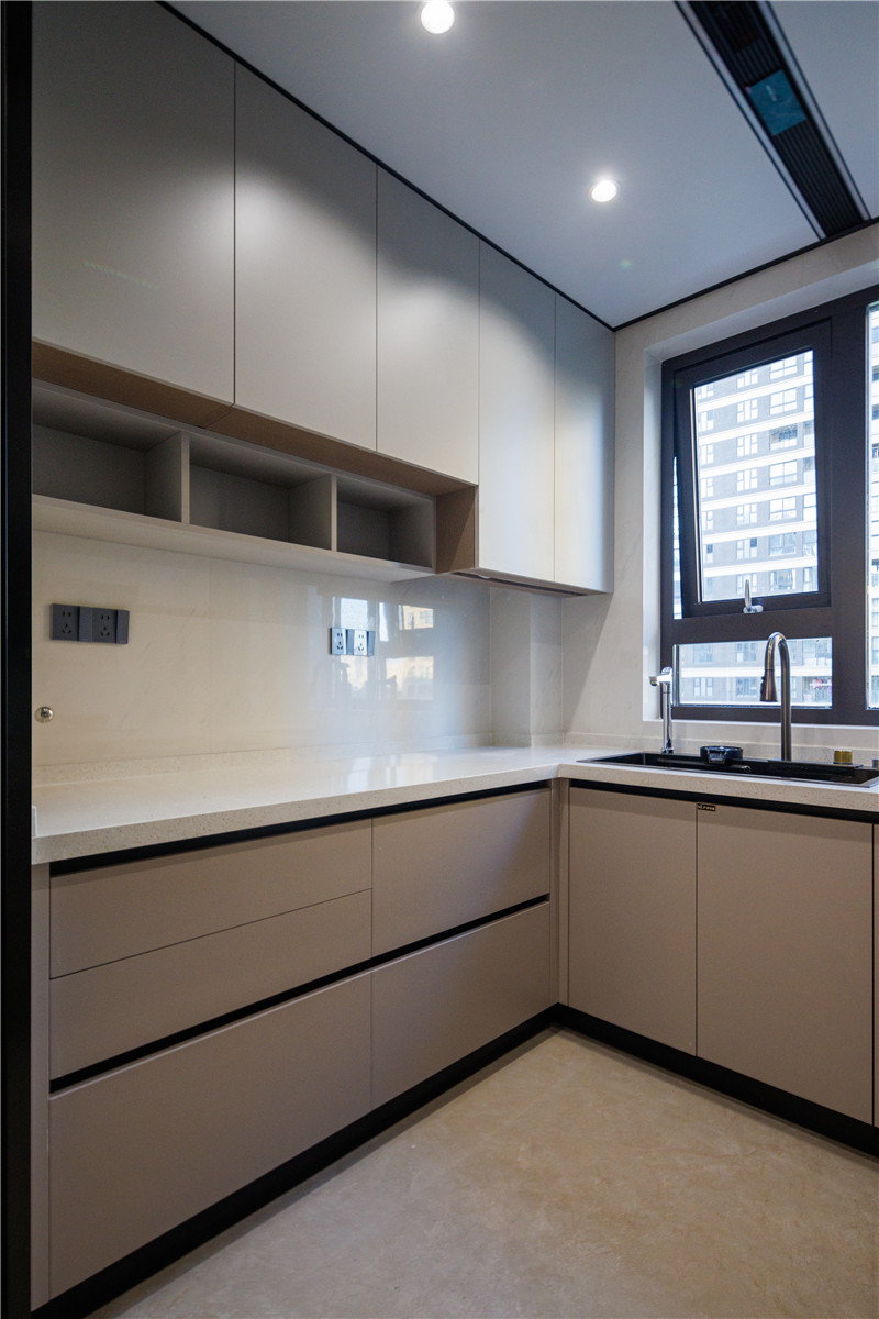 厨房柜体为科技直纹,以肤感带给居者质感体验;上柜兰迪灰搭配下柜米灰,温润自然;橱柜U型依墙而建,将烤箱电器嵌入其中,协调多物品收纳的难题。