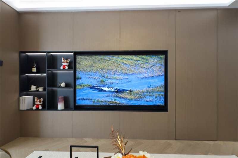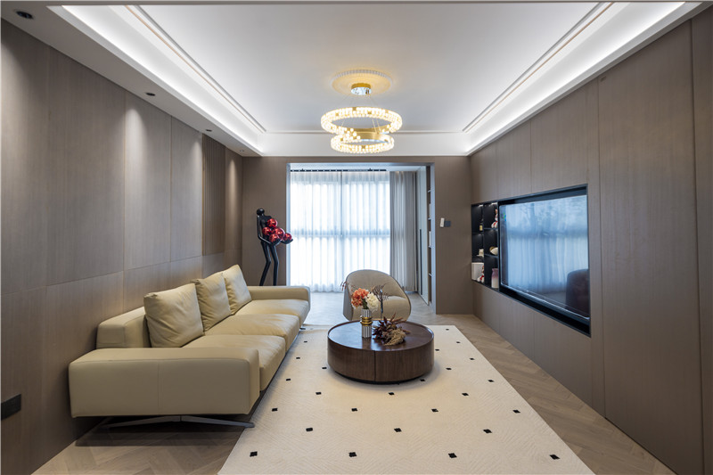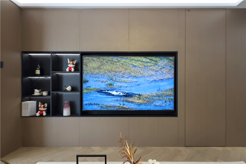 电视背景墙为科技直纹,电视机、装饰柜深调嵌入,以视觉差突出美感;沙发背景墙科技直纹+水漆科技银梨+栅格设计+射灯,拼接式彰显智慧;硬装与软装相辅相成,雅致大气。