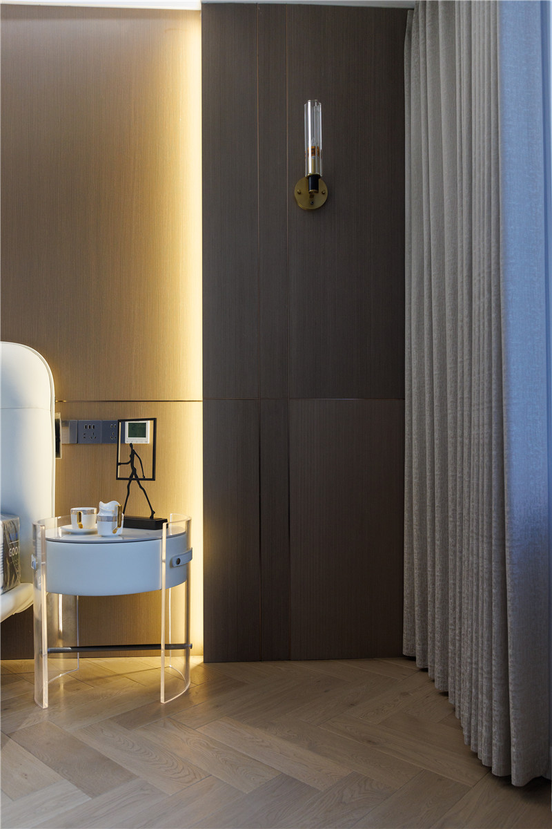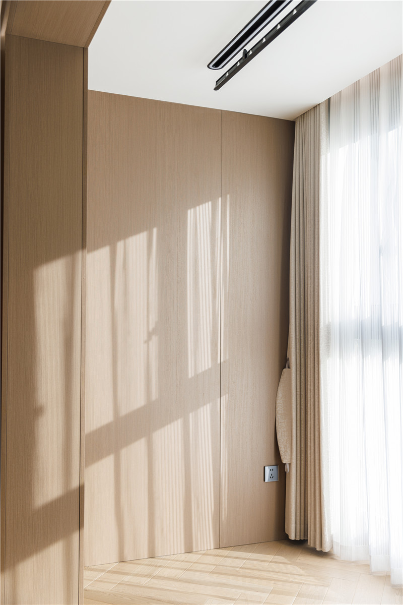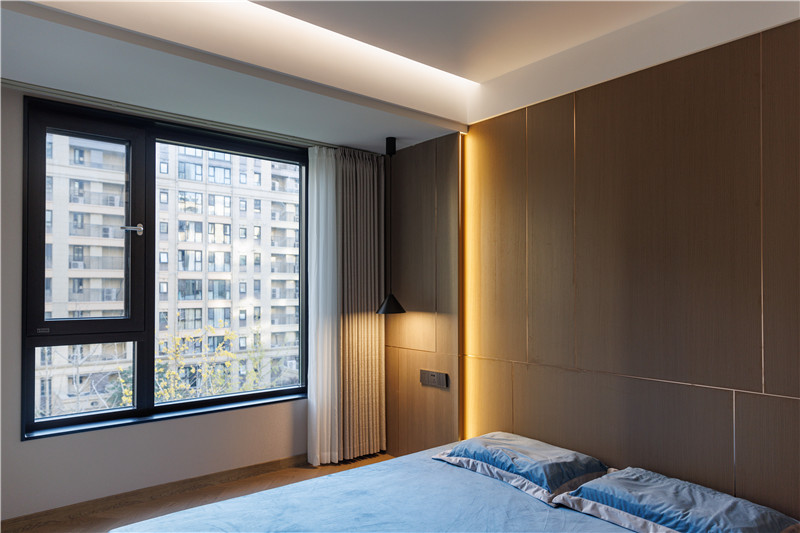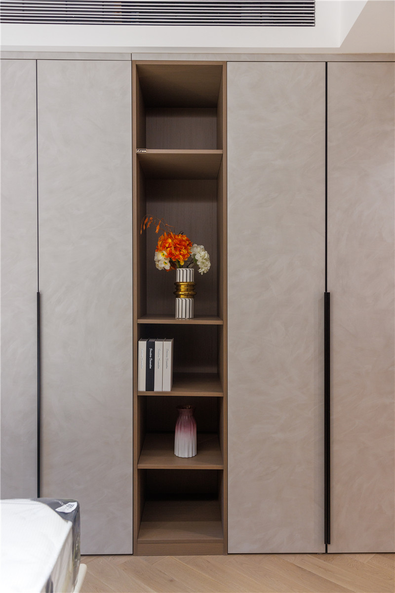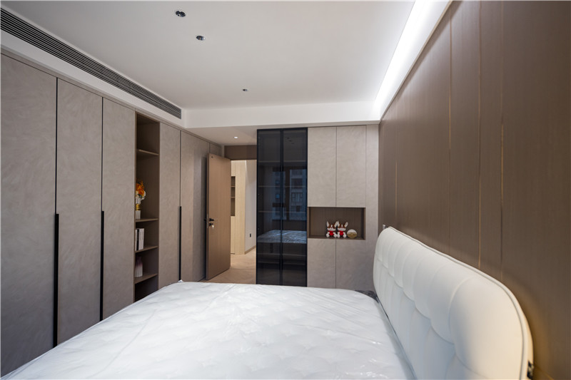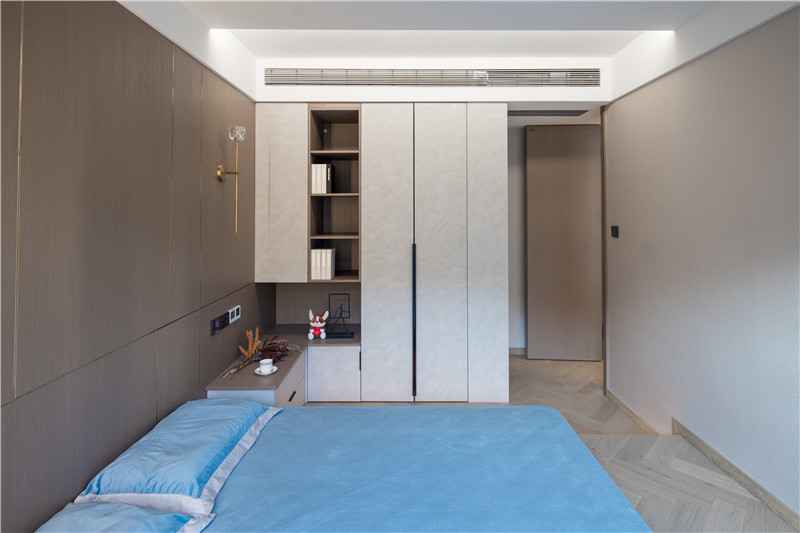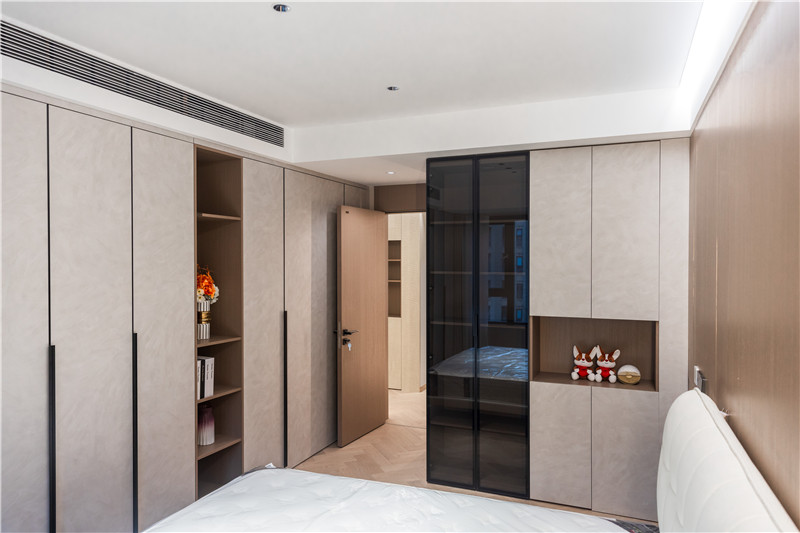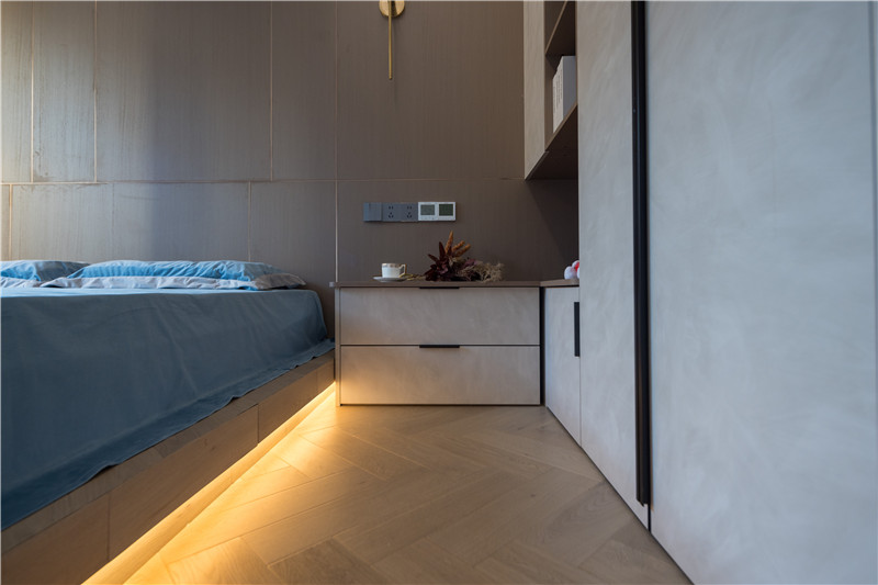 衣柜延伸以主卧的构造,差异于延伸床头柜,柜体科技直纹与水泥灰门板形成跳色,一体化设计和谐统一。
