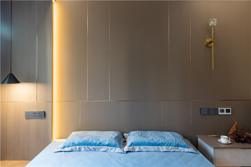 床体整体做抬高处理,下方嵌入暖系辅助灯光,格调感拉满;床头整面背景墙色、光、线层次展现,符合小资人群的审美。