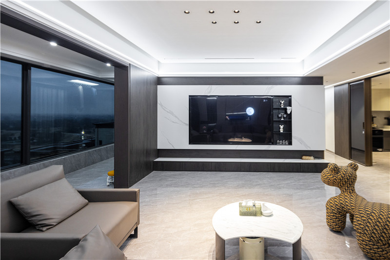 电视背景墙采用整面大理石纹背板,将电视机嵌入协调统一布局,侧边深调开放格放置装饰摆件,突显个性化;一字型电视底柜为无拉手设计,是小物件及常用物品的存放地。