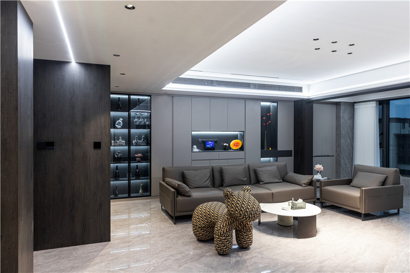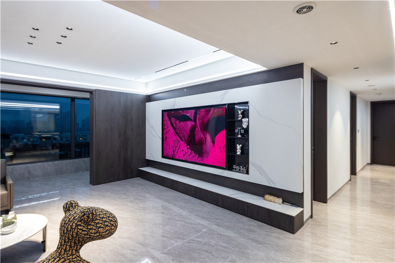 一侧玻璃展示柜,是手办区亦是藏酒区;一侧穿插设计嵌入灯光,是家里的氛围区;中部整面立柜,在合适高度掏空并预留轨道插座,实用性强。