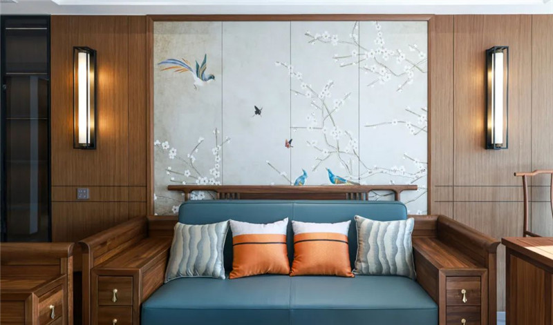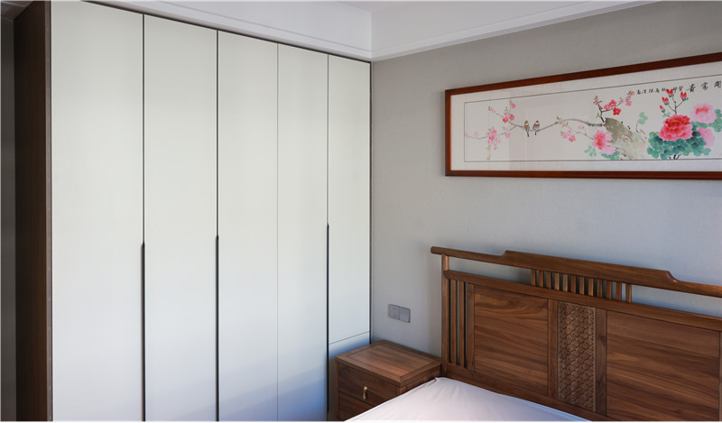 背景墙采用不规则拼接,实木与米白的配色经典和谐。背景墙中遵循了中式美学对称,简中有序,整个卧室洋溢着新中式意境。