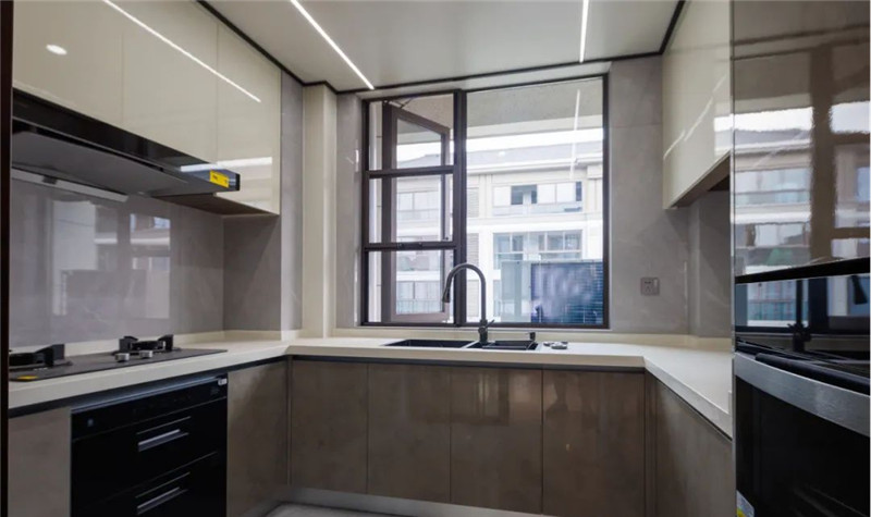柜门都选择了免拉手设计,使用起来更安全,视觉上简洁舒适。