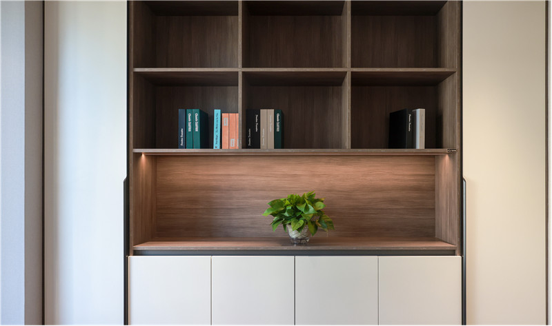 书房书柜设置了更多开放区,用来摆放书籍、艺术品、手办等物品,方便拿放的同时也增加了柜子的颜值。
