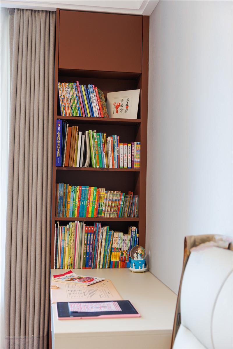 靠窗做小区域书柜,柜体延伸为床头柜,可做书桌、梳妆台使用;室内柜体合理分区、飘窗区作为闲适区,整体温柔好看。