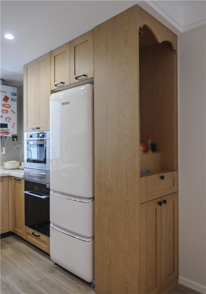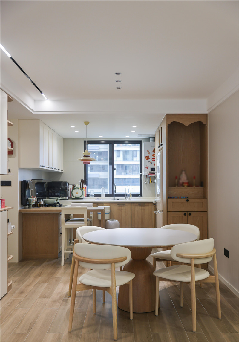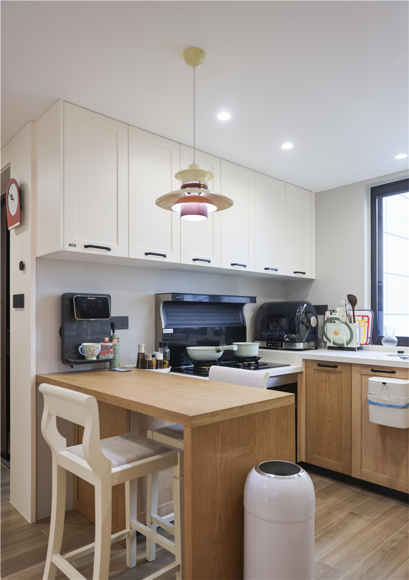 北欧橡木地柜带有浓郁自然气息的木作肌理,在空间中流露出精妙变化,与温润内敛的芬兰白吊柜形成视觉反差,丰富的空间层次让四方食事更具质感。