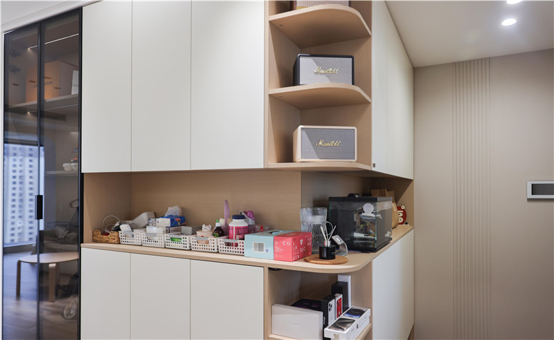 开放格与封闭柜有序衔接,拓展更多可能,定格出简而不凡的全屋基调。玻璃等元素融入木作,材质交叠下,美的传递由物抵心。