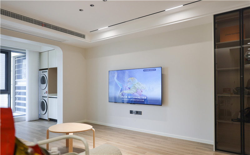 玄关与客厅交界处,定制了一处通顶组合柜进行空间过渡,兼具玄关柜和电视柜功能。圆弧转角设计,弱化柜体棱角,营造属于家的安心质感。凝练的线面关系,秩序井然又不失温度。