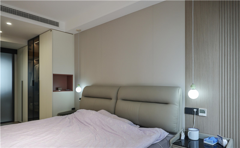 区别于客厅的四面落白,卧室整墙木饰面中和了空间结构带来的冷硬感,自然质感与柔和灯光的和谐共鸣,唤起生活的温情。
