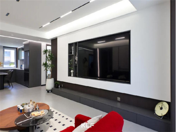 高级灰的色调在客厅间无限蔓延,开放格电视柜、极简线条背景墙、无主灯设计产生简明的节奏和呼吸感,娓娓道来,予人舒适优雅的宁静。