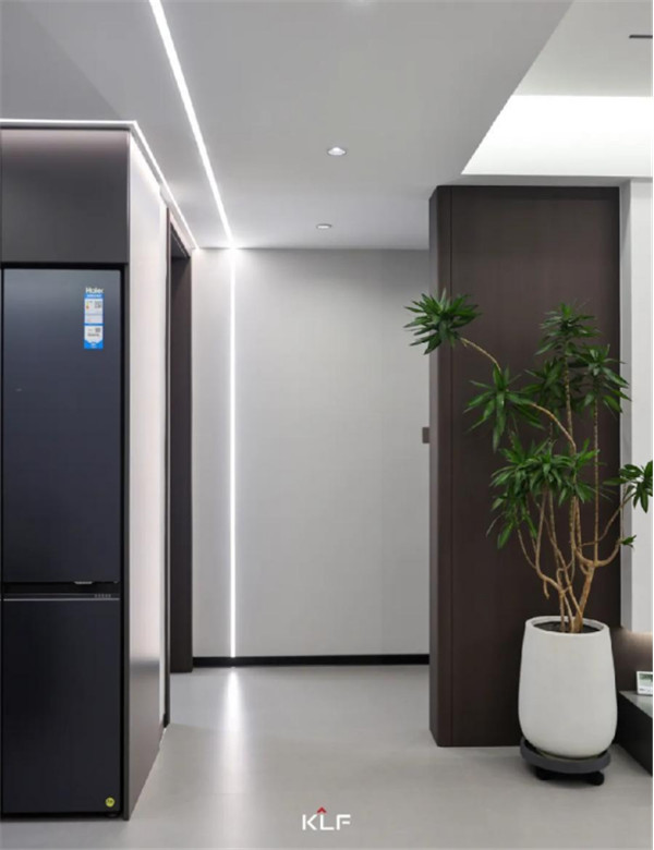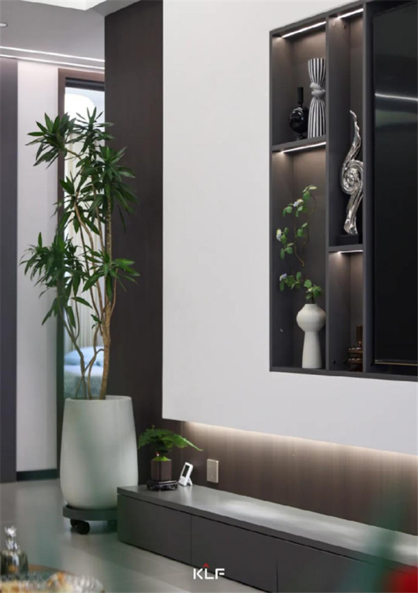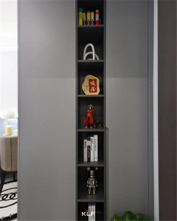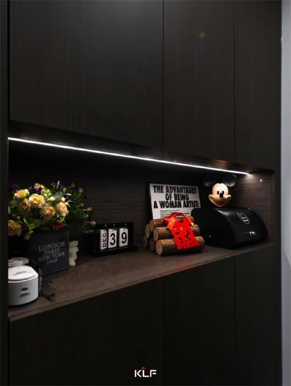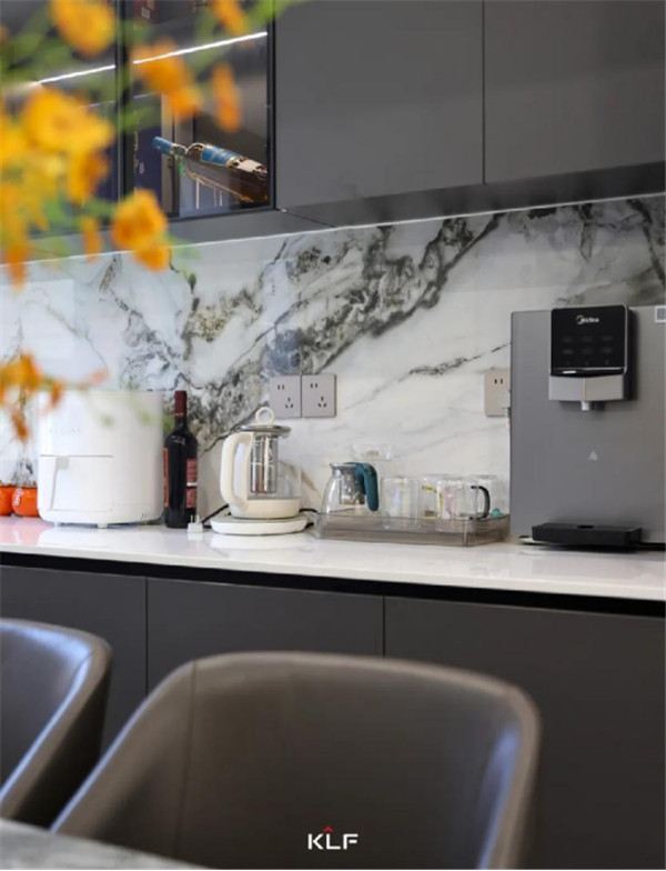 想要做到空间留白与有序收纳的平衡,开放式的开放柜与深灰色色彩碰撞,形成不同而合的视触觉体验,意式极简风之下,空间氛围更显宽敞。