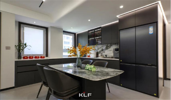 餐厅成开放式状态,宽广的台面和餐椅展露空间的社交属性,满足亲朋好友的聚餐品酒,橱柜采用烤漆板,冰箱巧妙嵌入厨房,将精致和触感演绎。