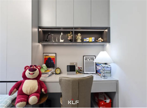 次卧空间与儿童房都在睡眠区+收纳区的基础上各自增设人性化定制的家居产品,儿童房中在床头设计的长书桌以及开放式收纳格,让整个房间功能更为丰富。