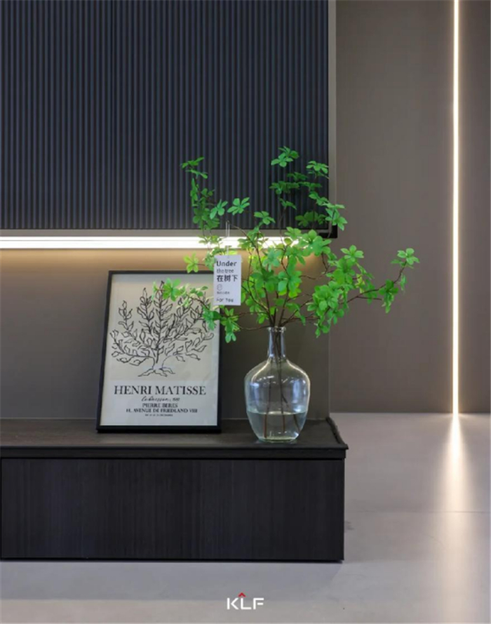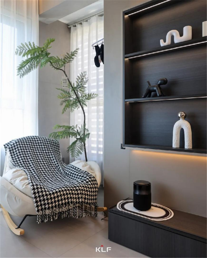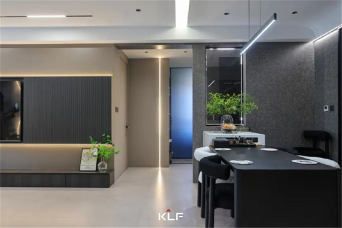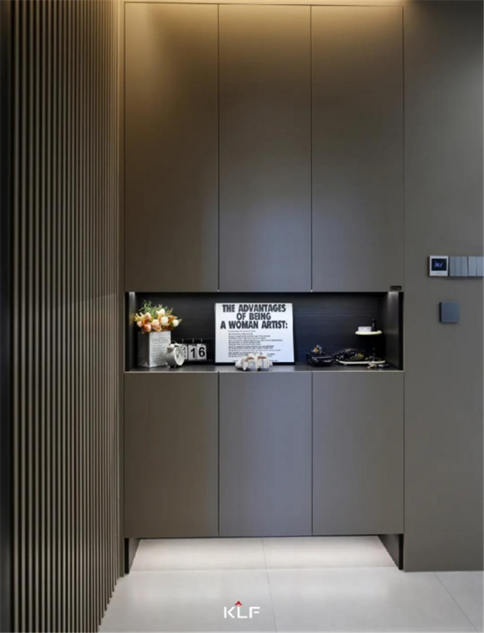 入户玄关,以内敛精致的设计风格,流露出新贵奢感,彰显现代意式的平衡之美。静谧的灰融化于玄关柜,哑光质感低调奢华,黑胡桃木背板内敛大气,搭配线条感十足的木格栅,层次丰富的材质拼接,流露出艺术气息与都市风尚。