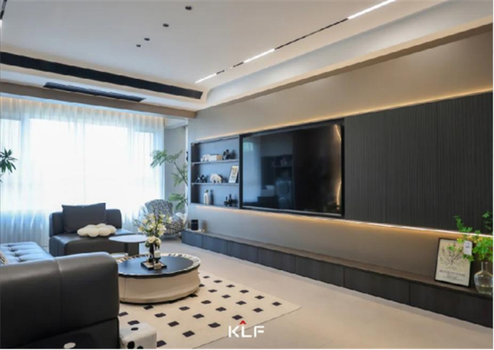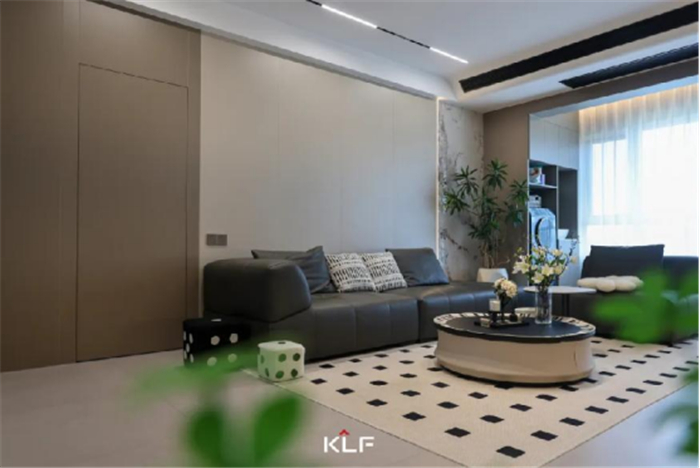 阳台链接客厅,打造出会客与观影、观景并存的空间。大面积落地窗增加通透感,搭配无主灯设计,解锁光的语言,光影艺术制造不容忽视的经典韵味。