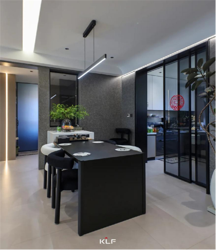 采用体块穿插的形式,组成岛台餐桌一体的结构,提供了餐厨空间的聚餐和交流功能。承袭黑白碰撞的张力,用克制又低调的语言,传递场域的精神。布艺餐椅和木质餐桌,搭配出新的视觉意趣。