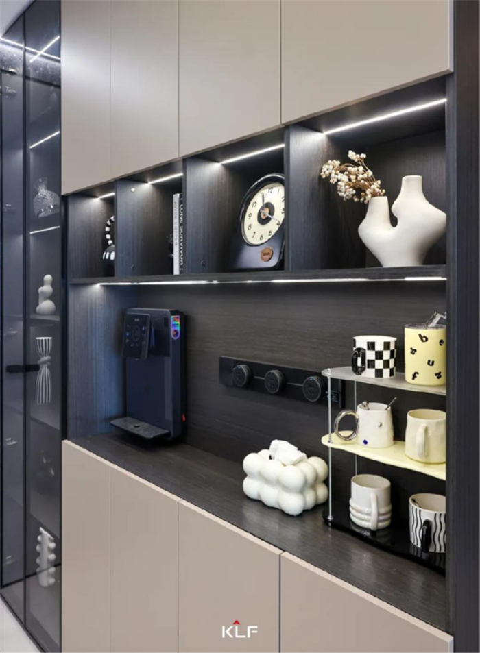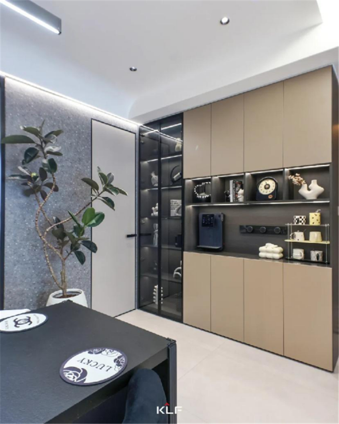 灰玻推拉门隔绝油烟,借玻璃通透特性自由连通,消弭了边界感。材质的细腻与其展示的简约形态,自然地将功能扩展、衔接,呈现出精致、纯净的生活仪式感。
