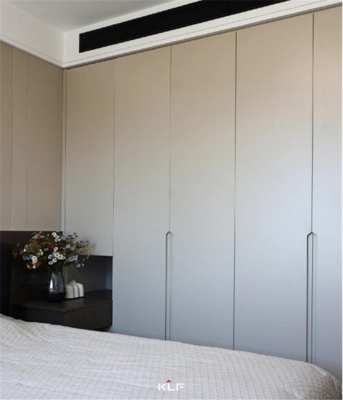 主卧保留了休息和储物两个基础功能。在这里,喧嚣已被摒除,流露出平静的力量。温润的材质与简单的几何造型相映衬,通过纯粹的手法,打造优雅松弛的起居包裹感。