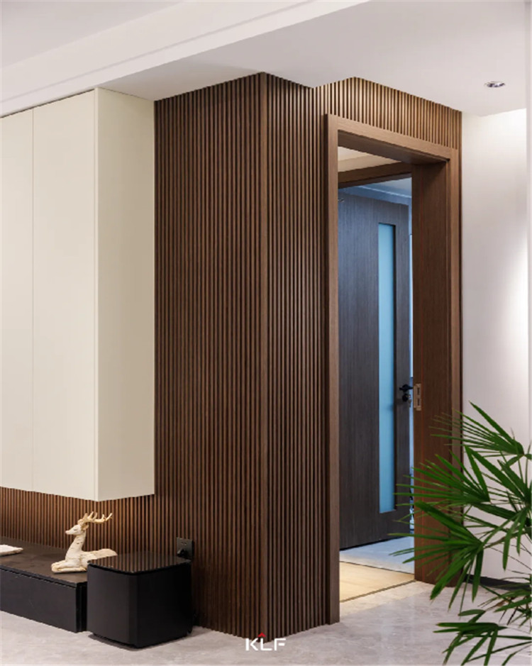 细格栅的造型墙板为墙面增加了立体感,一字型深灰色地柜直接落地,内嵌3D雾化暖炉,带给家更多温馨。