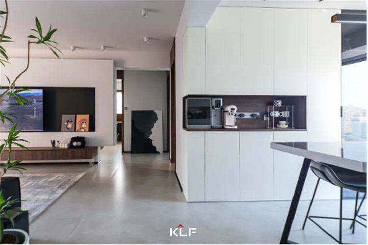 入户即是客厅,没有缓冲地带,在这样一览无遗的空间下屋主选择利用其厨房边的空间,以一组到顶高柜解决收纳问题,充足的收纳空间能够满足日常的生活需求。