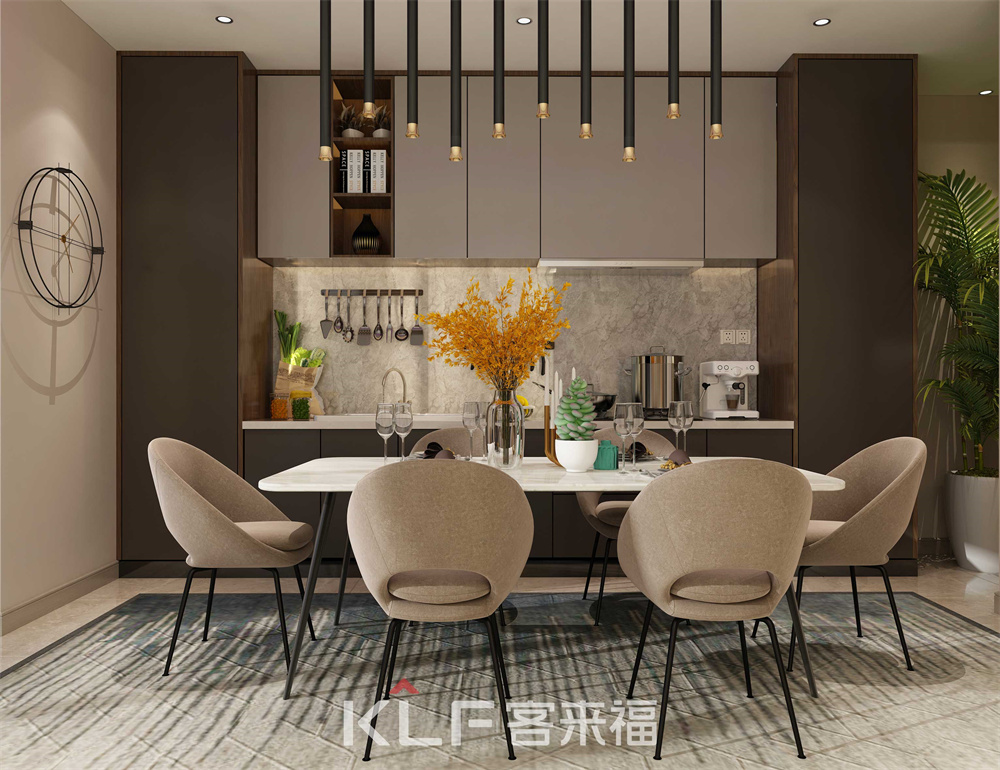 用餐时光是家中的温馨时刻之一,而开放式的空间设计深受大众欢迎。餐厅设计使用大量的米色,辅以精致的金属装饰、吊灯等,呈现了餐厅华丽的氛围与格调。