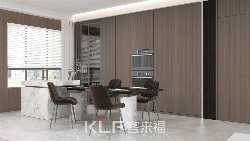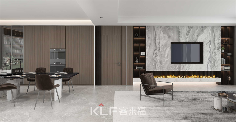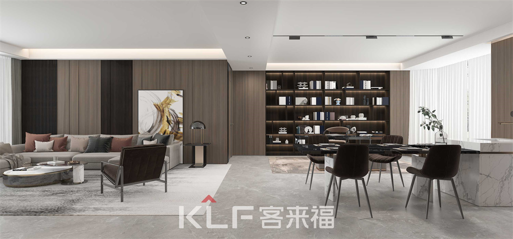 深咖色与木纹的巧妙结合,令客餐厅更显沉稳大气。顶天立地柜的嵌入式与半开放式设计,空间立体感油然而生。三两亲朋相聚洽谈,保证轻奢格调的同时满足你的多样化需求。