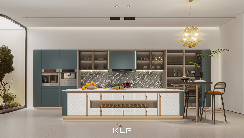 圆弧元素贯穿空间,线条显温柔之美。整面定制橱柜以鸢尾蓝为主色调,罗马柱、嵌入灯光的运用,勾勒出高级奢感;岛台整体呈椭圆形,岛台柜门采用米兰·(milan)IP皮革雕刻工艺,颜值在线;珊瑚白柜门与鱼肚白台面相呼应,颜色更具层次感。